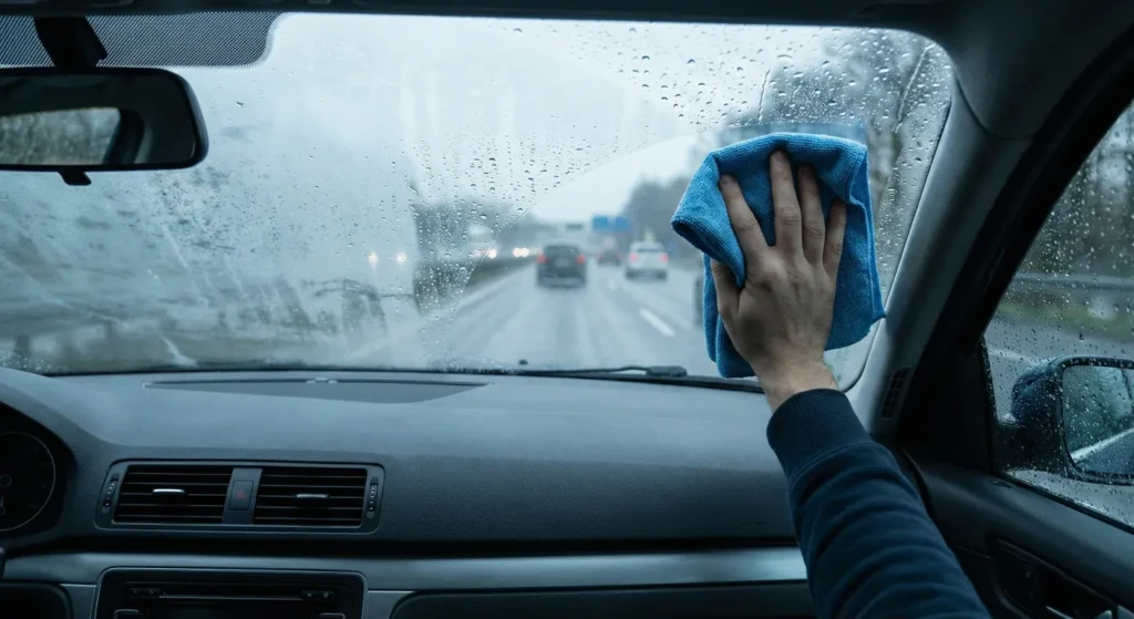 Nunca conduzcas "asomando la cabeza" o limpiando con la mano mientras conduces. Si se te empaña el coche en marcha (algo común si empieza a llover de repente), mantén la calma, activa el aire acondicionado y baja un poco las ventanillas. No intentes limpiar el cristal con la mano en movimiento, ya que la grasa de tu piel dejará estelas que deslumbrarán con las luces de los coches de frente.