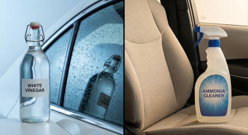 Jamás mezcles vinagre y amoniaco (ni amoniaco con lejía) en el mismo cubo. La reacción química libera gases de cloramina que son altamente tóxicos para tus pulmones. Úsalos siempre por separado y ventila bien el coche.