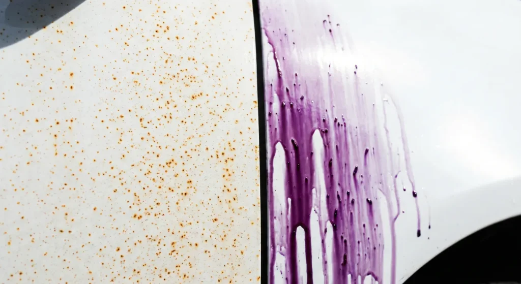 Esas manchas son partículas de hierro (polvo de frenos de otros coches, contaminación industrial o de vías de tren) que vuelan por el aire, se clavan en la capa de laca transparente y se oxidan allí al contacto con la humedad. En un coche oscuro son invisibles, pero en uno blanco arruinan la estética. Frotar con una esponja no sirve de nada y solo rayarás la pintura. Necesitas un ataque químico.