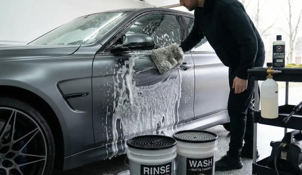El Champú: Aquí está la clave. Busca un champú diseñado para pinturas mate. La referencia mundial es el Chemical Guys. Estos jabones lubrican mucho pero no añaden brillo ni polímeros, dejando el acabado satinado original intacto.