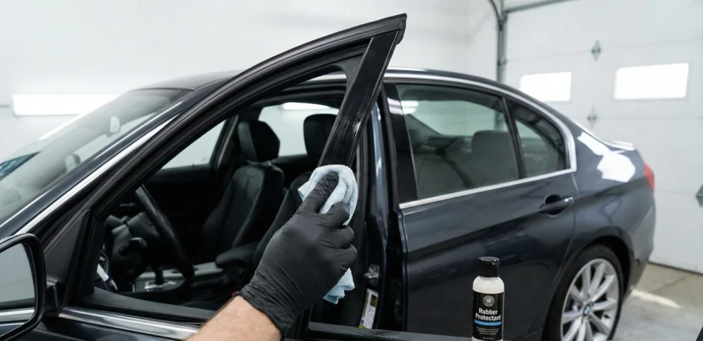 Además de los burletes de estanqueidad, tu coche tiene muchas otras gomas: marcos de parabrisas, juntas de antena, molduras de techo, etc. El tratamiento para estas piezas es idéntico al de las puertas. Mantener estas gomas negras y nutridas crea un contraste visual precioso con la pintura brillante, haciendo que el coche parezca años más nuevo. Puedes combinar este proceso cuando vayas a restaurar los plásticos exteriores para un detailing completo.