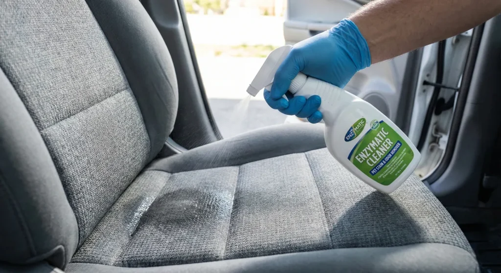 Estos productos, disponibles en tiendas de mascotas y detailing, contienen cultivos de bacterias "buenas" y enzimas específicas que se alimentan literalmente de la materia orgánica de la orina (urea, proteínas y ácido úrico), rompiendo los cristales a nivel molecular y eliminando el olor de raíz, no tapándolo. Es la misma tecnología que usan los forenses o los hoteles.