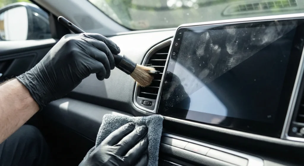 Rocía el limpiador tipo Maddox en la brocha o en una microfibra (nunca directo al salpicadero para no manchar el cristal por dentro). Frota haciendo círculos pequeños. Verás que se genera una espuma ligera que se vuelve gris: es la suciedad saliendo de los poros. Retira inmediatamente con una microfibra limpia.