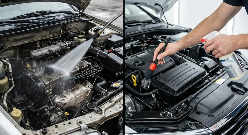 Si te preguntas si debes llevar tu coche a petrolear o si es mejor hacerlo tú mismo con técnicas de detailing (limpieza en seco), has llegado al lugar correcto. En esta comparativa técnica analizamos los riesgos del método tradicional frente a la seguridad del método moderno, para que puedas tener un motor impoluto sin miedo a que se encienda ninguna luz de avería en el cuadro.