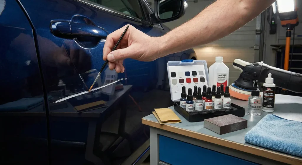 - El barniz (clear coat): La pintura de retoque suele ser mate. Aplica encima una fina capa del barniz transparente que viene en el kit para sellar y dar brillo.